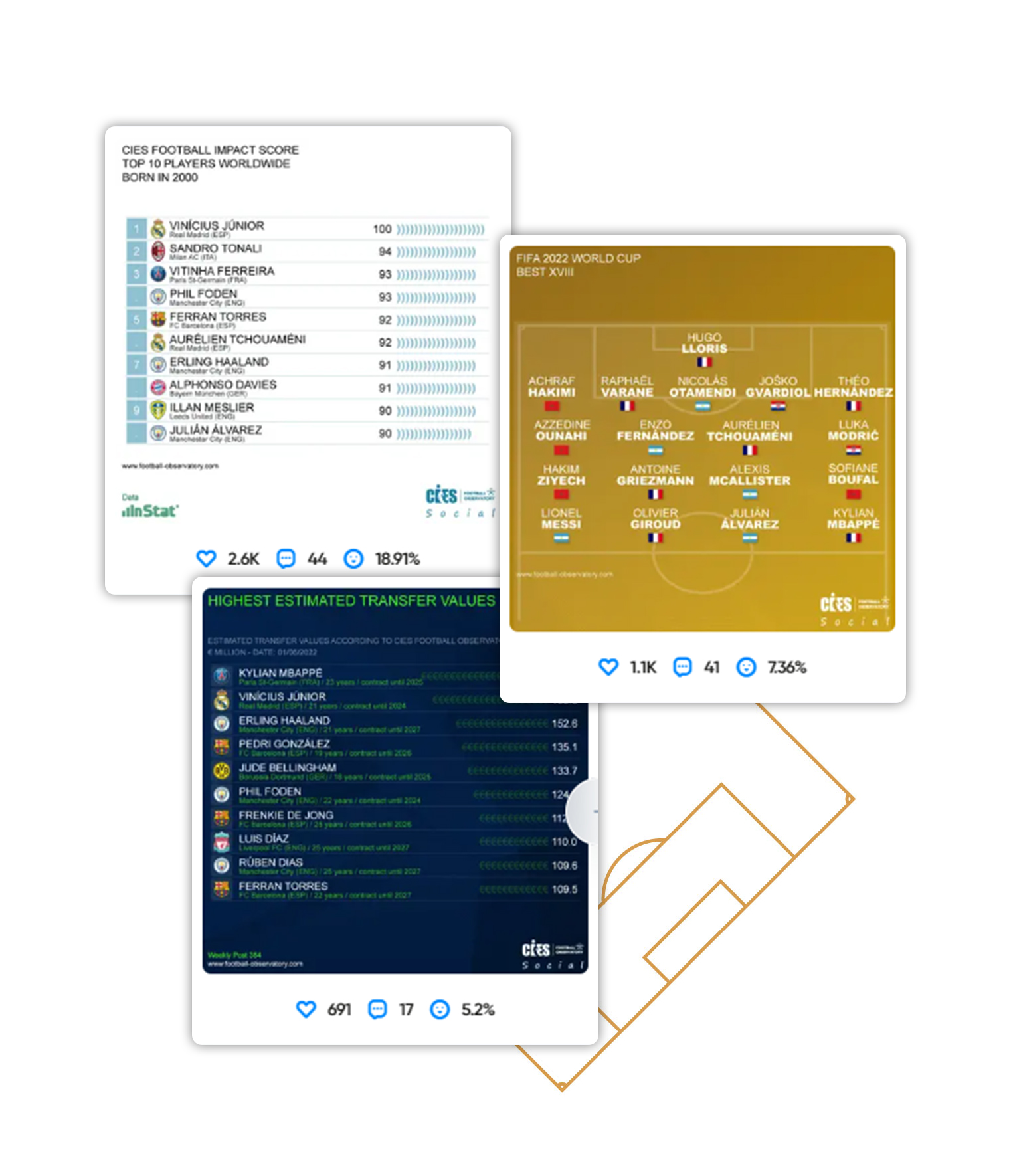 In 2022, 850,000 visitors logged almost 2.3 million views on the CIES Football Observatory website. Its Monthly Reports and Weekly Letters provide interested parties, such as the media and the general public, with a wealth of information, much of it unpublished and based on rigorous and innovative analysis of football facts. This information is relayed by generalist and specialist media around the world, who rightly regard the Observatory as an essential reference point on the subjects it covers.