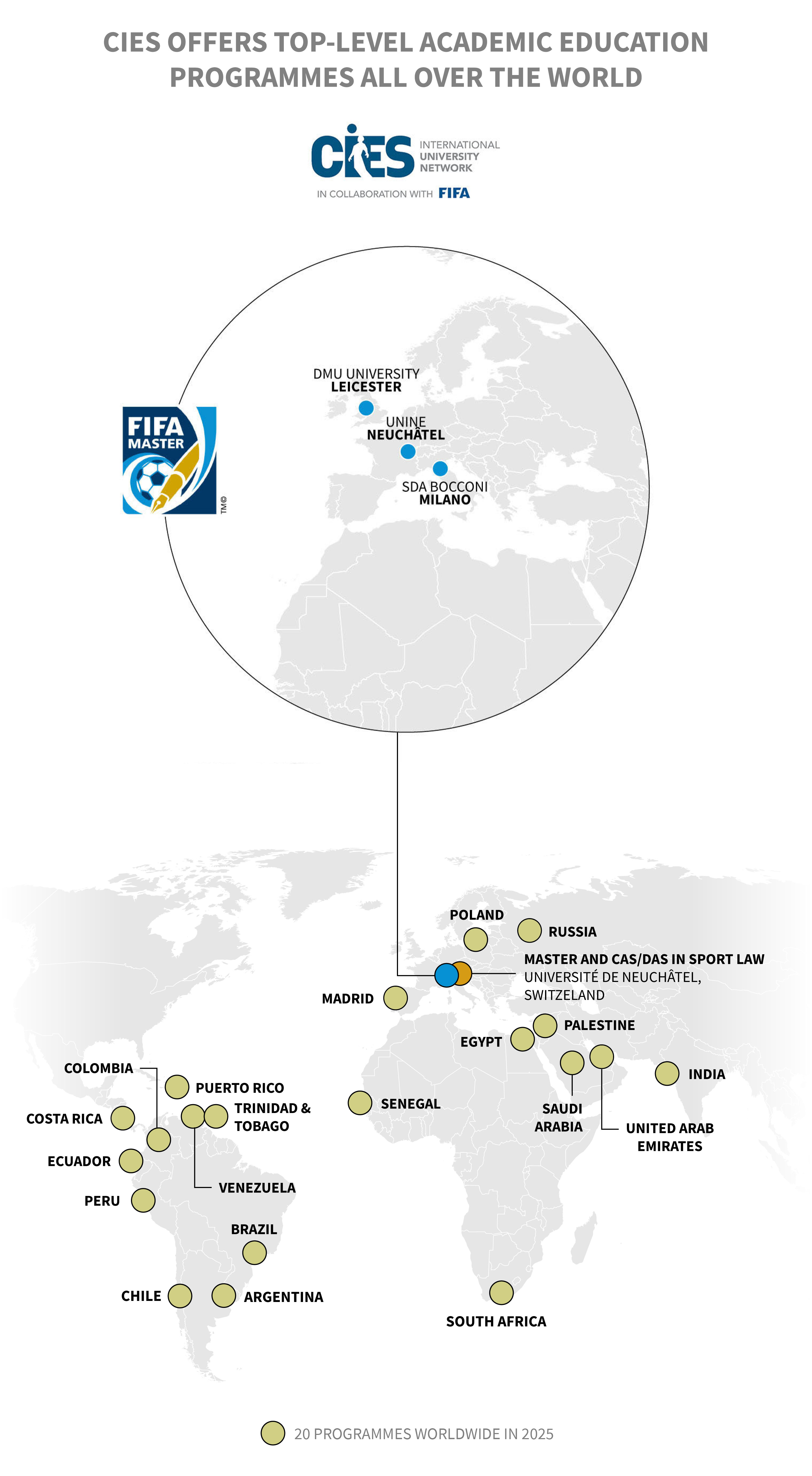 In addition, it still operates as the headquarters of the International University Network, now offering the FIFA/CIES Programme in Sports Management in 20 countries worldwide, following its expansion to Saudi Arabia. To date, more than 7,000 students - of whom almost 90% now work in sport and around 70% in football – have studied on the CIES International University Network course.